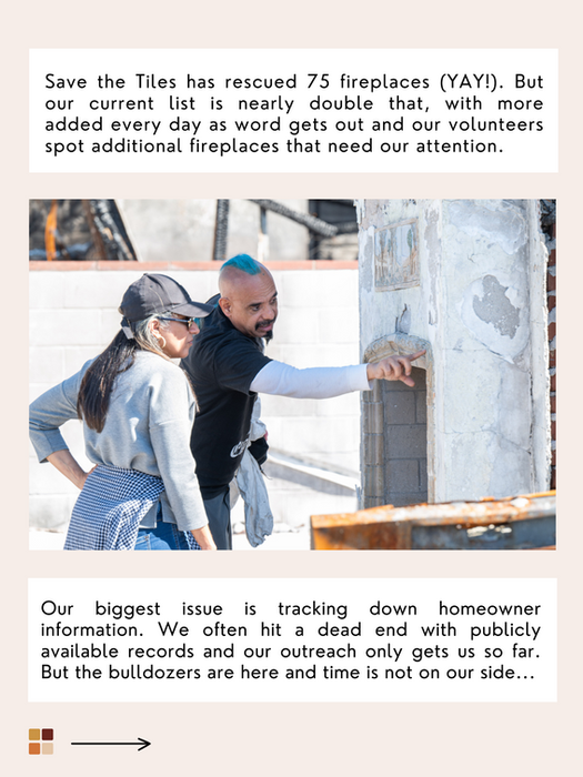 Our beautiful mountain town burned. But miraculously, hundreds of original historic tile fireplace surrounds have survived in Altadena. We are a volunteer army of residents, preservationists, and heritage organizations in a race against time to help owners rescue their treasured original craftsman tiles from homes destroyed by the wildfires. We remove, preserve and store the tiles at no cost to the homeowners. But we must act fast because the bulldozers are here and ready to sweep this history away forever. Please help us save the tiles!